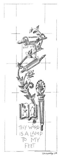 Illustrating God’s word is a scroll, bearing the Hebrew word, “Scripture” with a torch symbolizing the “lamp to my feet.”