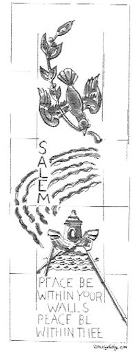 The name “Salem” and the Hebrew word “shalom,” meaning peace, come from the same root. In this window, the dove of peace comes with an olive branch in its beak, reminding us of the hopeful ending of the story of Noah and the flood.